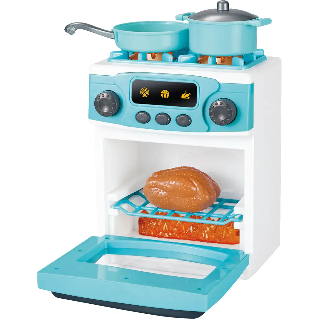 Sada obsahuje dvouplotýnkový plynový sporák, troubu s otevíracími dvířky a osvětlením, pánev, hrnec a také hračku pečeného kuřete – takže hra může začít okamžitě! Otočné knoflíky vydávají cvakací zvuk, trouba svítí a vaření je s přiloženými nádobami ještě opravdovější. Při hře na role zažívají děti radost z vaření, zatímco rozvíjejí jemnou motoriku, kreativitu a schopnost řešení problémů.