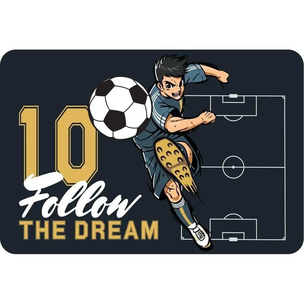 Dynamický fotbalista na tmavém pozadí, nápis „10 Follow the Dream“ a kresba hřiště přenáší děti do sportovního světa. Toto není jen podložka na psací stůl – je to inspirativní pomůcka, která může pomoci, aby učení bylo stejně dynamické jako gólová šance na hřišti!