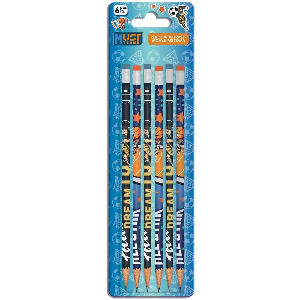 6 grafitových tužek s gumou s fotbalovými a basketbalovými motivy