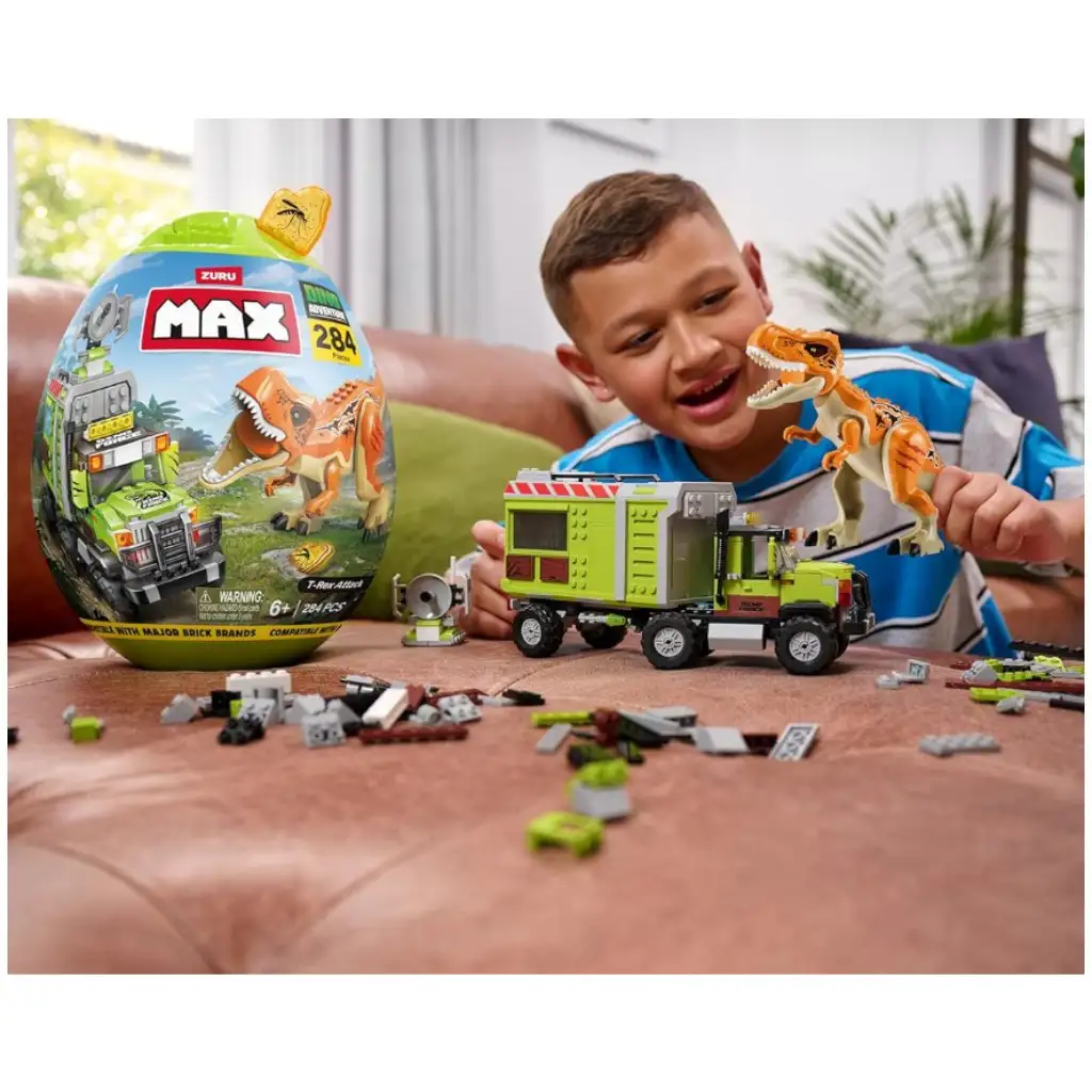 Ponoř se do divokého světa dinosaurů s největší sadou MAX Dino Adventure! Ve vajíčkové kapsli s více než 300 stavebními dílky najdeš vše, co potřebuješ pro vzrušující a akční dobrodružství: obrovskou pohyblivou figurku T-Rexe, dva odvážné objevitele, masivní terénní vůz s otevíratelnou zadní částí a spoustu dalších doplňků. Stačí jen stavebnici sestavit, nastartovat fantazii – a lov na dinosaury může začít!