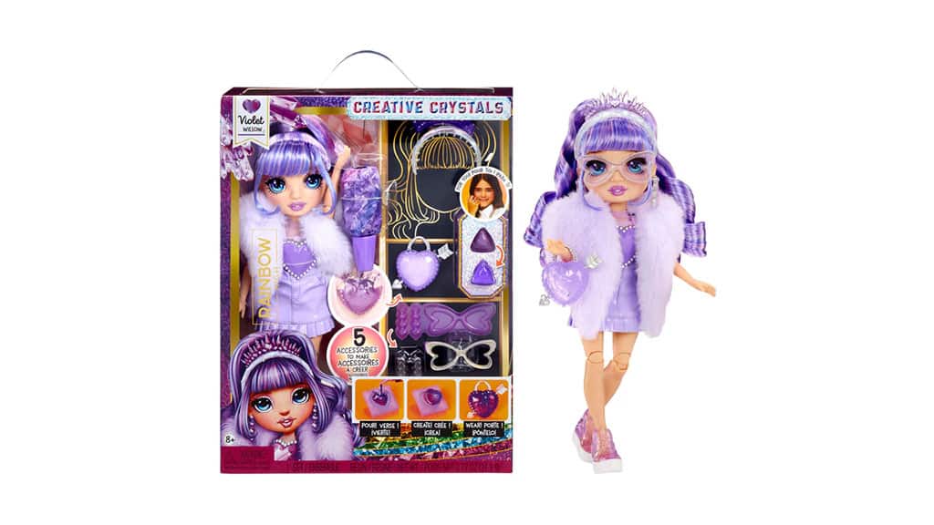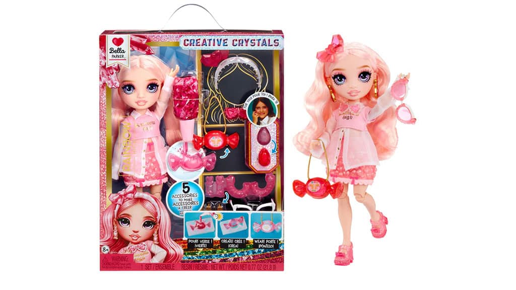 Kolekce MGA Rainbow High Creative Crystal Dolls oslavuje tvořivost, kreativitu a módu v klasické podobě panenky. Každá panenka přichází s nástroji, které umožňují dětem rychle a vzrušujícím způsobem vytvářet roztomilé a barevné doplňky pro jejich nového módního přítele. S pomocí přiložené pryskyřice a forem mohou děti přidávat ozdoby k již zábavnému a jedinečnému vzhledu panenek pomocí vlastnoručně vyrobených pryskyřičných kousků. I když není čas na tvoření (nebo po dokončení pryskyřičných doplňků), tyto panenky zůstávají zábavné. Díky ohebným končetinám a kombinovatelným vlasům poskytují hodiny zábavy a radostných zážitků. S kolekcí pěti panenek si děti mohou vybrat svou oblíbenou nebo doufat, že je všechny sesbírají.
