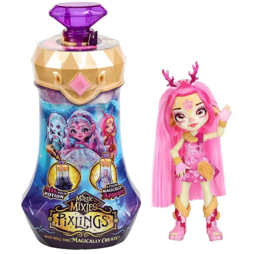 Seznamte se s Deerle, jednou z kouzelných panenek kolekce Magic Mixies: Pixlings, která s dlouhými růžovými vlasy a doplňky inspirovanými okolní přírodou přímo vystoupila z pohádkového lesa. Panenka Deerle stojí v centru kouzelného rituálu, kde děti vytvářejí kouzelný lektvar a s pomocí drahokamu ji vyvolávají z tajného skleněného světa. Dobrodružství na vás čekají!