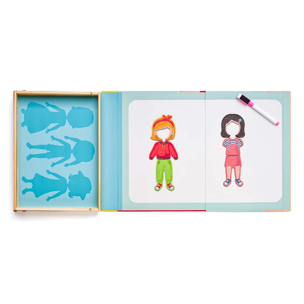 Krabička ve tvaru knihy se zavíráním zajišťuje praktické uložení, takže se oblečení neztratí a je ideální i na cesty. Vnitřní magnetická tabule poskytuje stabilní podklad pro tvoření, a přiloženým stíratelným fixem můžete dokreslovat další detaily kolem postaviček. Hra rozvíjí jemnou motoriku, kreativitu, sebevyjádření a schopnost kombinovat, přičemž dlouho zabaví vaše dítě.