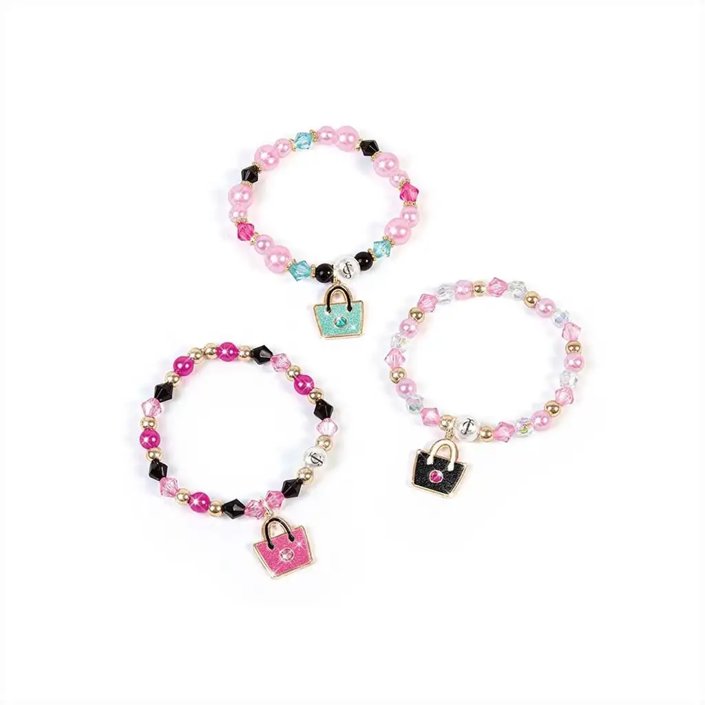 Sada obsahuje krásné korálky, elegantní přívěsky a 3 speciální mini kabelky, které slouží nejen k uchovávání, ale i jako stylový doplněk. Děti mohou volně kombinovat růžové, zlaté, černé a tyrkysové odstíny a tvořit zcela originální šperky. Náramky se navlékají na pružnou šňůrku, díky čemuž jsou pohodlné na nošení a kdykoli je lze znovu přetvořit.