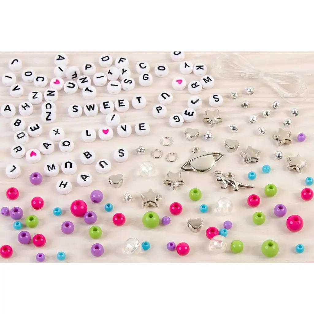 V krabici najdete 60 písmenkových korálků, takže dítě může napsat jakékoliv slovo nebo jméno, ať už své vlastní, oblíbené slovo, inspirativní vzkaz nebo tajný kód mezi kamarádkami. 70 barevných korálků (růžové, fialové, zelené, modré a průhledné) lze perfektně kombinovat s písmenky a speciální kovové přívěsky ve tvaru hvězdy, srdce, planety nebo dinosaura udělají výsledné náramky ještě atraktivnějšími.