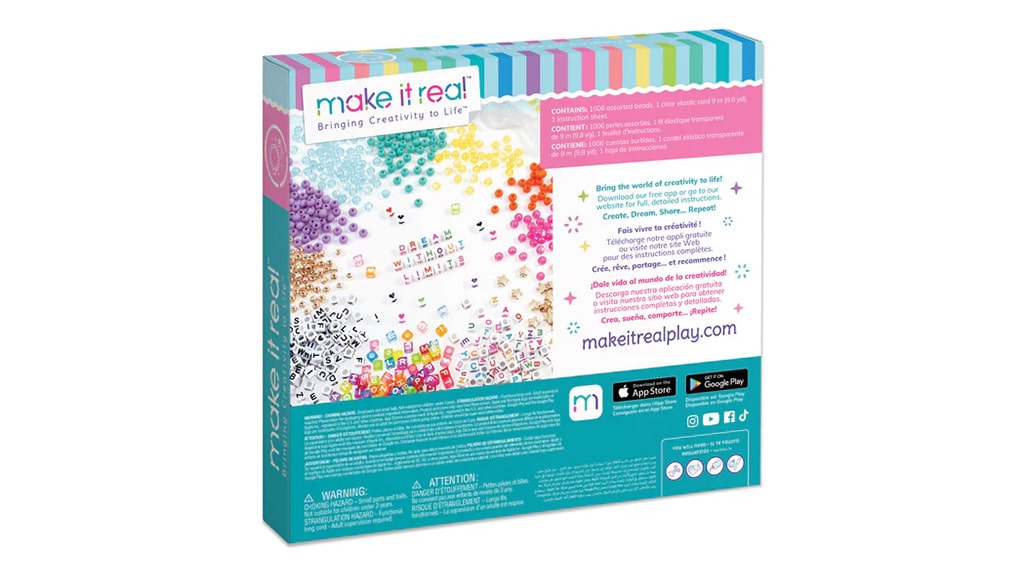 Sada obsahuje pouze korálky a šňůru, takže budete potřebovat nůžky, abyste šňůru ustřihli na požadovanou délku. Pro podrobné návody a nápady na projekty navštivte webovou stránku Make It Real nebo si stáhněte jejich bezplatnou aplikaci z obchodu Google Play nebo Apple App Store.