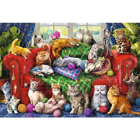 Puzzle s názvem Malá koťátka na pohovce bude jistě velkým hitem mezi milovníky koček, protože na obrázku je velká červená pohovka, na níž a kolem níž odpočívají a hrají si kočky nejrůznějších druhů a velikostí. Dílky puzzle Trefl perfektně pasují a díky kompromisním, profesionálním tiskovým postupům je hotový obrázek dechberoucí ostrosti a barevnosti, takže se může stát nejkrásnějším ozdobou jakékoli místnosti.