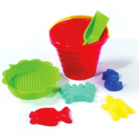 Tento set může být skvělým startovním setem pro malé dítě. Kompletní set obsahuje vědro s vlnkovým vzorem, sítko, které pomáhá prosít písek od větších kusů, a formičky. Lopatka je nezbytným doplňkem každé hry v pískovišti. Formy poskytují další zážitek pro vaše dítě. Vědro lze použít i jako formu pro hodiny stavění hradů, pokud se vaše dítě rozhodne pro vážnější stavbu. Všechny nástroje jsou vyrobeny z odolného plastu, aby zůstaly trvalou součástí dětských hraček.