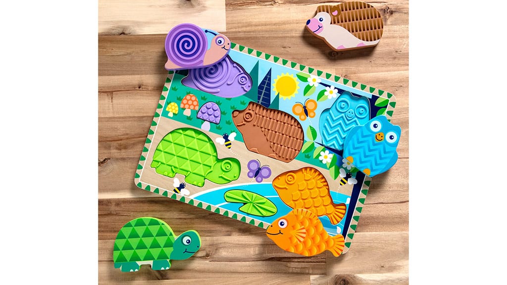 A Erdei barátok tapintásfejlesztő puzzle je nová sada pětidílného puzzle, která představuje roztomilá lesní zvířátka: hněžkého ježka, zelenou želvu, oranžovou rybu, fialového šneka a modrou sovu, kteří se všichni sešli kolem jezera. Děti od 2 let mohou dílky puzzle přikládat k měkkým silikonovým texturám na desce, čímž rozvíjejí své schopnosti řešit problémy a zároveň zažívají vzrušující smyslový zážitek.