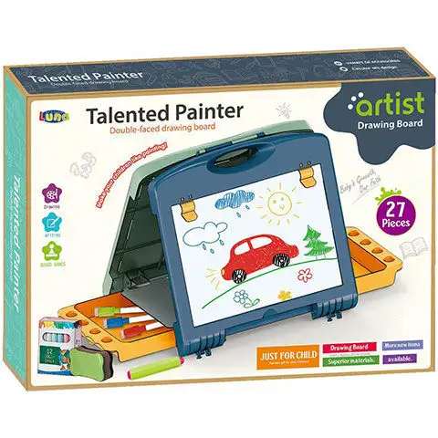 Pro kreativní děti je skvělou volbou tato oboustranná kreslící tabule, na které mohou volně tvořit a během okamžiku kdekoliv vytvořit kreslířské studio. Sada je umístěna v plastové tašce s rukojetí, kterou lze jedním pohybem rozložit a dokonce ji lze upevnit i ve stojící pozici. Uvnitř krabice se nachází užitečné drobnosti, jako jsou smývatelné barevné fixy, houba a na zadní straně tabule připravené figurky a kostka pro hru Hadí a žebříkové hry.