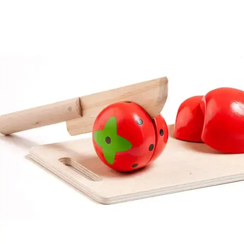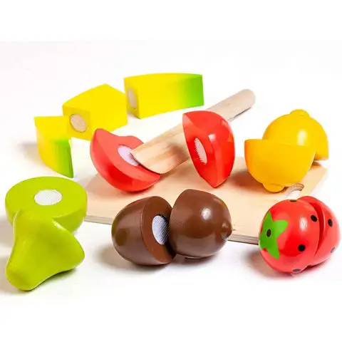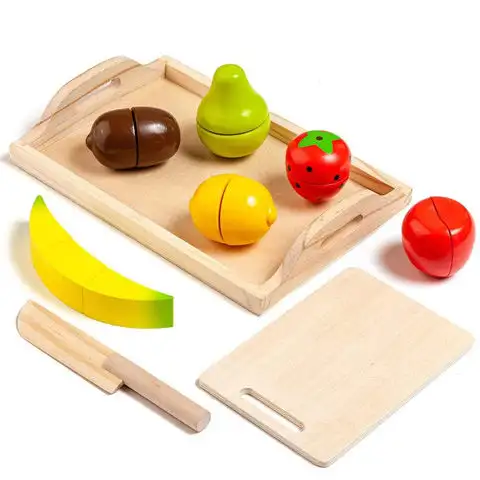 Tento dřevěný ovocný set může být skvělým doplňkem k dětským kuchyňským hrám, protože obsahuje celkem šest různých druhů ovoce: jablko, hrušku, banán, citron, kiwi a jahodu, které jsou všechny navrženy s unikátním designem. Kousky ovoce jsou spojeny suchým zipem, takže děti mohou během hry prožívat skutečný pocit krájení. Součástí hračkové sady je kromě nože také podnos a prkénko, takže na něm mohou podávat kousky ovoce.