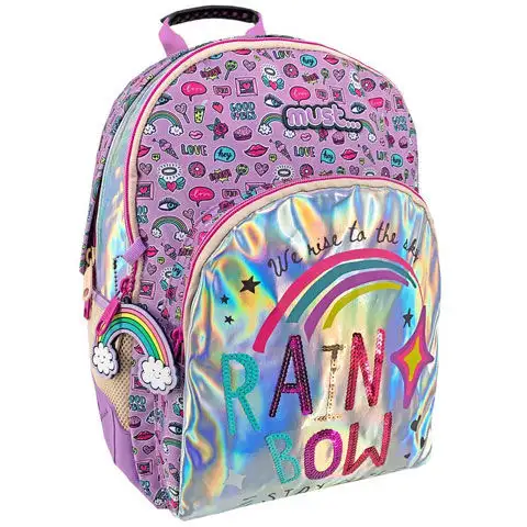 Dívky jsou si jisté, že si zamilují tento batoh, protože je celý v růžové barvě a je zdobený mnoha malými, dívčími vzory, které ho činí jedinečným. První kapsa je celá vyrobena z perleťově lesklého materiálu, který zdobí nápis Rainbow. Batoh je nejen stylový, ale také velmi pohodlný, za což vděčí polstrovaným popruhům a zadní části. Kromě pohodlí byl kladen důraz také na praktickou konstrukci, která se projevuje v mnoha různě velkých přihrádkách a gumových bočních kapsách, což velmi usnadňuje organizaci obsahu tašky.