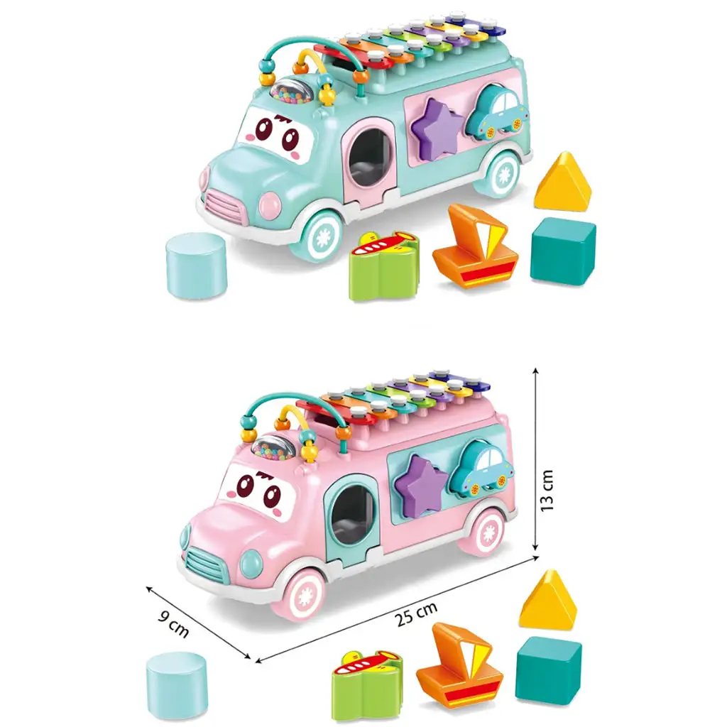 Na přední části autobusu se nachází zvonek a kuličková dráha, a na jeho boku je otvor pro vkládání tvarů, což pomáhá dětem rozvíjet jejich jemnou motoriku a zručnost. Tyto hračky podporují děti v rozpoznávání tvarů a rozvoji schopnosti řešit problémy.