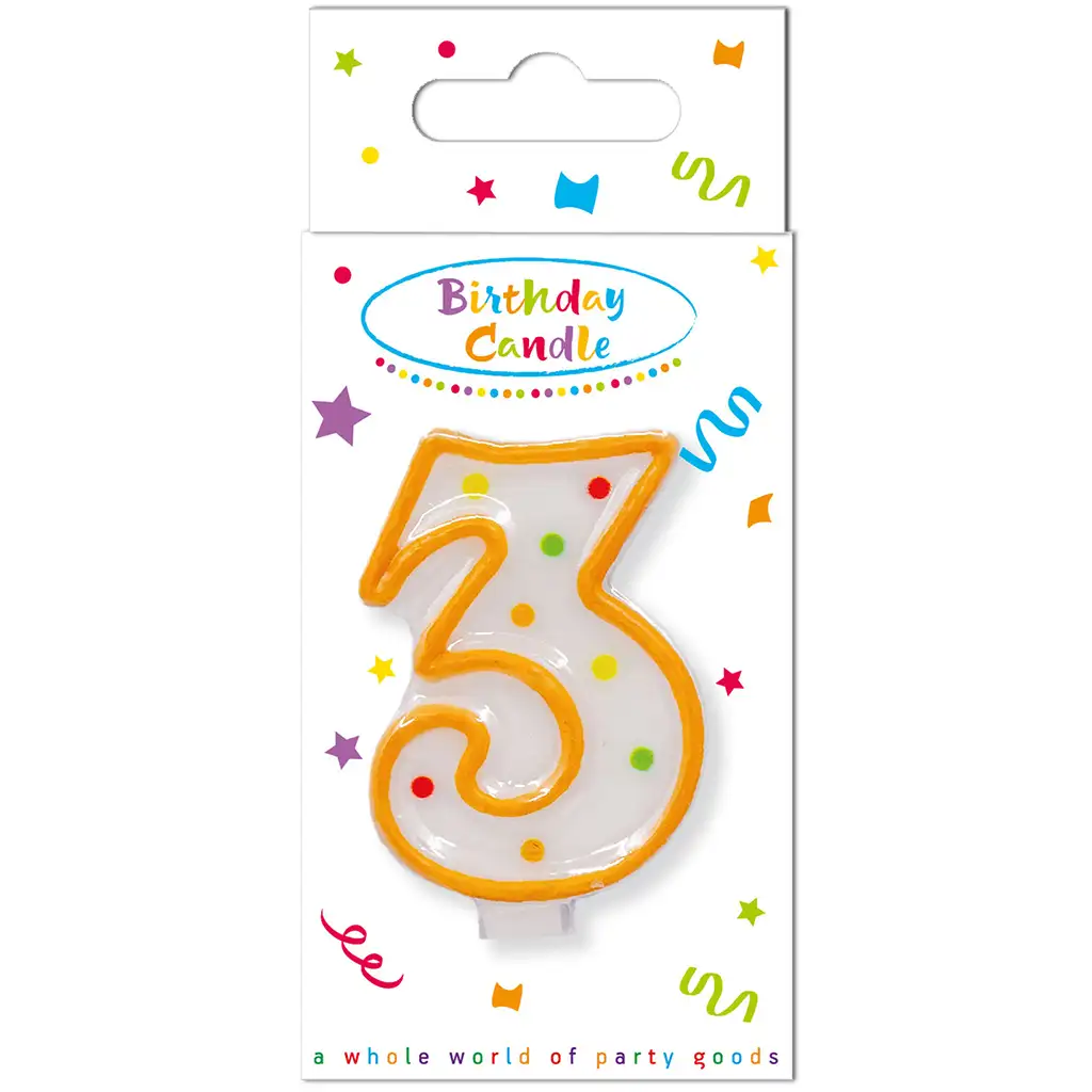 Blíží se velký den? Překvapte své dítě opravdu veselou narozeninovou ozdobou na dort – svíčka s číslem 3 s puntíky je perfektní volbou pro oslavu třetích narozenin! Bílý základ svíčky zdobí barevné puntíky a oranžový obrys jí dodává opravdu živý a hravý vzhled.