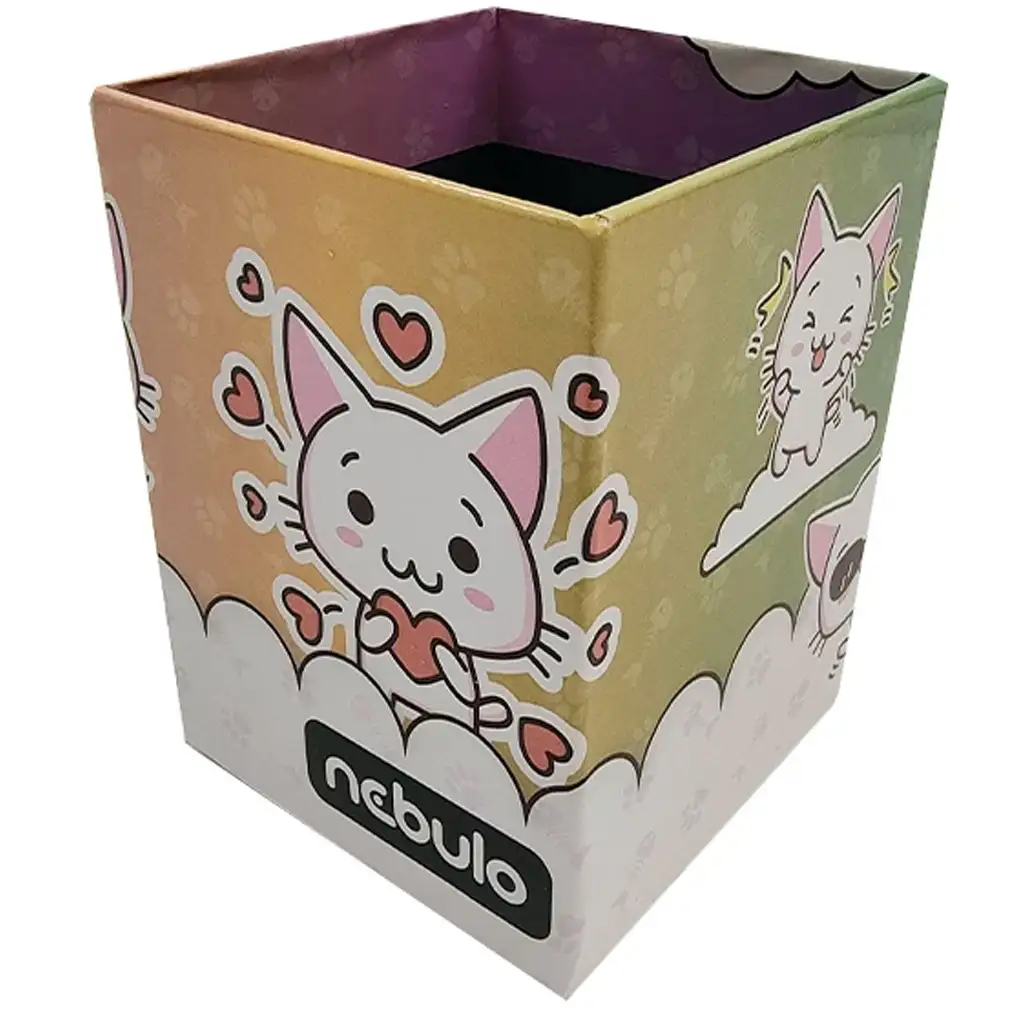 Nebulo stolní stojan na psací potřeby – Kočičí může být veselým a roztomilým doplňkem každého psacího stolu, ať už se jedná o dětský pokoj, školní studijní kout nebo domácí kreativní zákoutí. Krabičku zdobí na všech stranách roztomilé, usměvavé kočky, které rozhazují srdíčka do vzduchu – rozhodně ti zpříjemní den a vykouzlí úsměv na tváři tvého dítěte pokaždé, když ji použije.