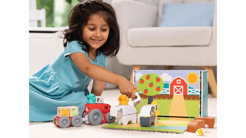 Vytvořte hospodářská zvířata a vybavení s 56dílnou sadou, která obsahuje stavební kostky, spojovací prvky, figurky, plstěné doplňky a kolečka. V balení najdete krávu, ovci, prasátko, koně, slepici, stejně jako traktor s přívěsem, krmivo a balík sena. Speciálně navrženo pro malé ruce a VELKOU představivost: velké dřevěné stavební kostky a plstěné doplňky jsou ideální pro to, aby si děti mohly stavět nahoru, dolů i do všech směrů a zároveň popustit uzdu své fantazii.