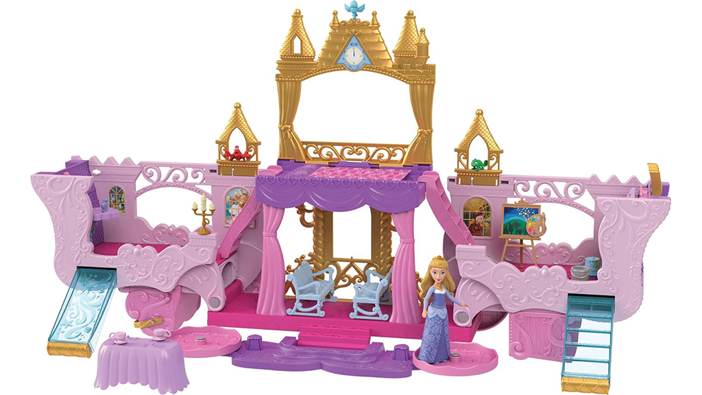 Přeměňte kočárek na třípatrový zámek. Sada obsahuje panenku Auroru, čtyři přátele, nábytek a mnoho dalšího, a také poskytuje místo pro další malé panenky Disney princezen. Tento kouzelný zámek dává dětem možnost ponořit se do světa pohádek a vytvářet vlastní příběhy. Různé úrovně nabízejí různé pokoje a prostory, kde může dětská kreativita rozkvétat. Zámek lze snadno přeměnit, takže na malé princezny a jejich přátele vždy čekají nové dobrodružství.
