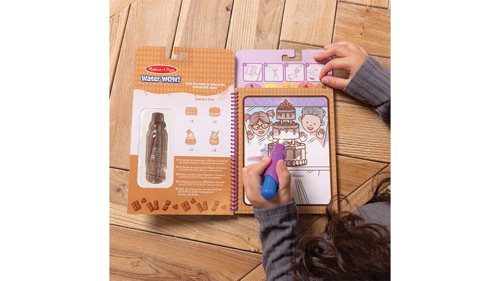 Děti mohou používat znovuplnitelný vodní štětec, který byl navržen speciálně pro malé ruce, aby mohly vybarvovat stránky vodou a zároveň objevovat jemné vůně. Stránky lze použít opakovaně, takže když voda uschne, děti si s nimi mohou hrát znovu a znovu. K dispozici jsou vzory Treats (sladkosti) nebo Fruits (ovoce).