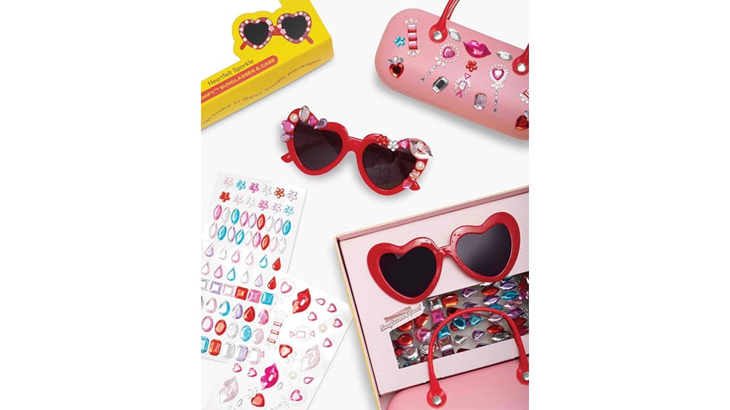 Tato sada je zároveň kreativní rukodělnou činností a třpytivým, módním doplňkem. Děti si mohou podle vlastního vkusu ozdobit červené, srdcovité sluneční brýle s ochranou UVA/UVB a také růžovou taštičku na přenášení. Balení obsahuje více než 100 samolepek ve tvaru srdce, rtů a bonbónů s třpytivými kamínky, takže si každý může opravdu originálně vyzdobit své vlastní brýle a pouzdro . Tato sada nejenže poskytuje zábavnou činnost, ale také rozvíjí kreativitu a zručnost, zatímco děti mohou hrdě nosit opravdu stylový, vlastnoručně vyrobený doplněk.
