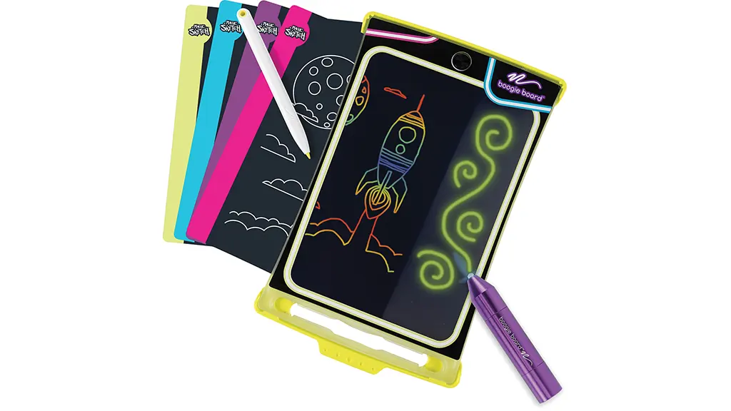 Tato umělecká sada svítící ve tmě obsahuje opakovaně použitelnou, šablonovou kreslící tabulku s ochranným krytem a osmi šablonami. Děti mohou kreslit a čmárat, a pak svá díla osvětlit pomocí Kouzelného světelného pera.