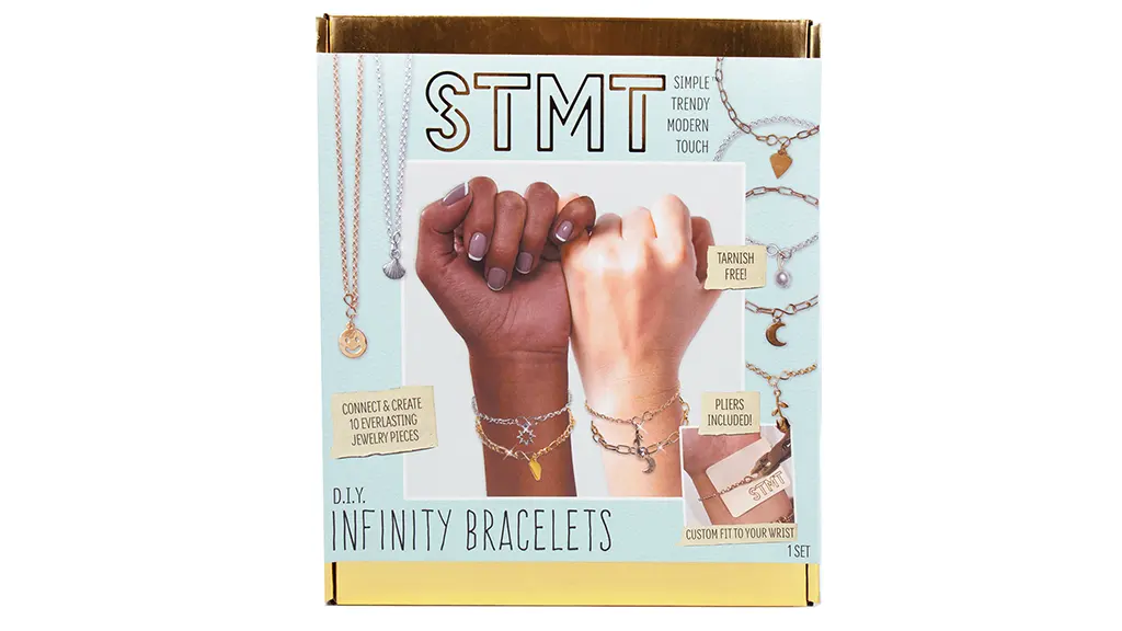 Tato sada pro výrobu šperků obsahuje nekonečno značky, voděodolné řetízky, ochranné kryty a spony, které mohou děti použít k vytvoření 10 jedinečných náramků s nekonečnem bez potřeby spon nebo nástrojů.