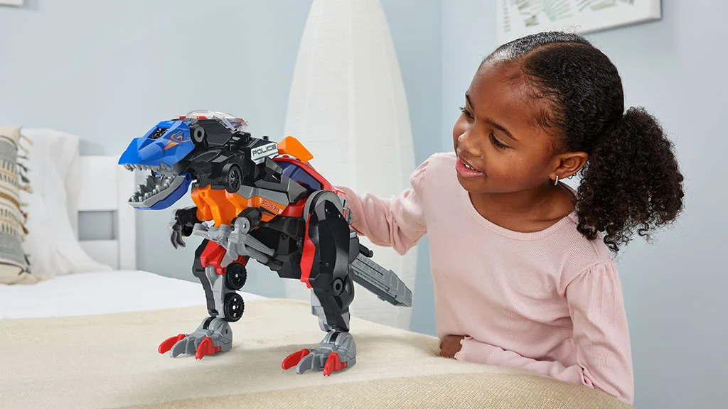 Děti mohou kombinovat hasičské auto, záchranářský vrtulník a policejní auto do řvoucího T. rexe s animovanýma očima. Policejní auto má světla a věty, hasičské auto má vysunovací žebřík, zatímco vrtulník obsahuje otáčející se vrtuli.