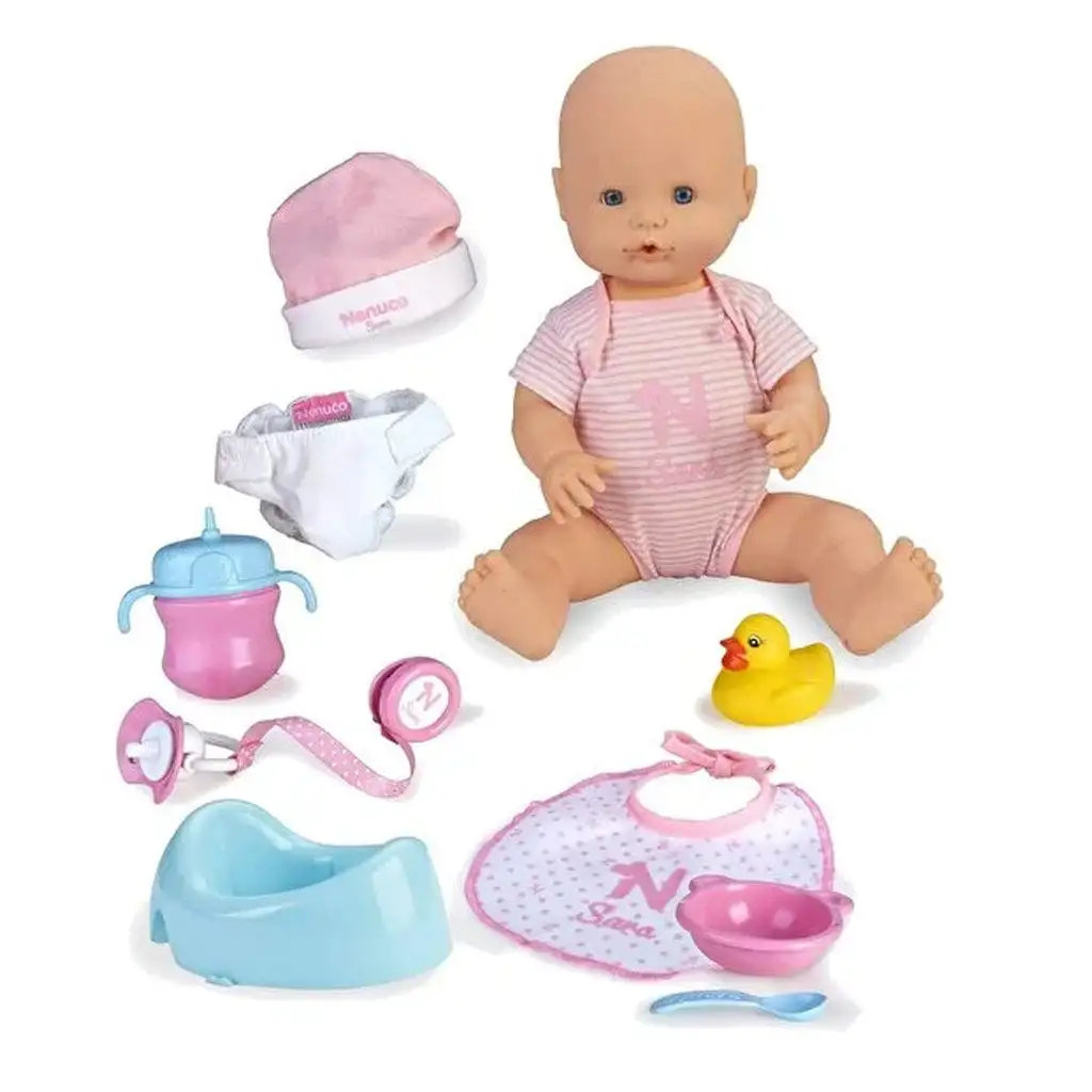 Obsah: 1 ks panenka, 1 ks čepice, 1 ks plenka, 1 ks láhev na pití, 1 ks dudlík, 1 ks miska, 1 ks zástěrka, 1 ks miska, 1 ks lžíce, 1 ks kachnička na koupání.