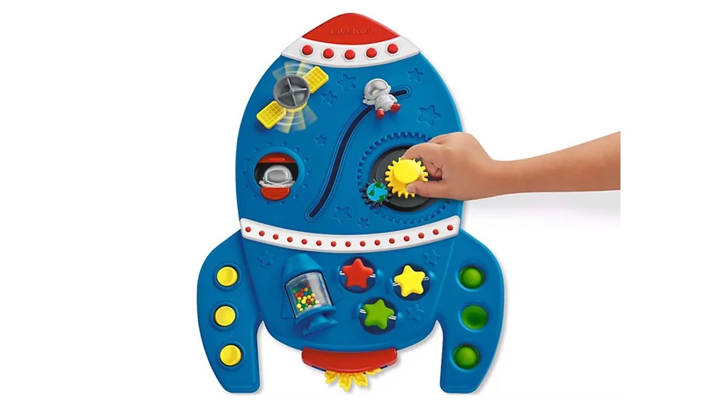 Tato raketa tvarovaná hmatová deska nabízí celou sbírku vesmírných smyslových zážitků. Na desce se nachází astronautova skluzavka, otáčející se měsíc a mnoho dalších prvků.Out of This World Fidget Board zaujme děti ve věku 3-6 let světem plným smyslových her. Raketově tvarovaná deska obsahuje mnoho připojených doplňků, včetně všeho od astronautovy kluzky po otáčející se satelit.