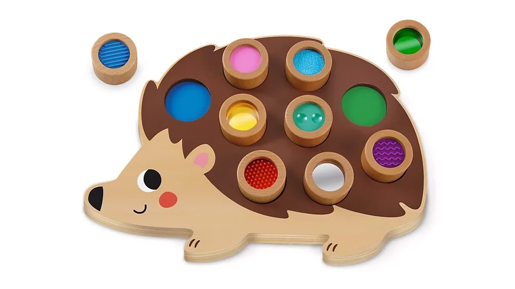 Tato puzzle deska ve tvaru divokého prasete obsahuje "trny", jejichž barvy odpovídají kruhům na desce. Do trnů jsou vloženy textury a vizuální prvky pro smyslový zážitek.Malí milovníci zvířat najdou v Senzorickém ježkovi Objevování & Spárování jedinečnou smyslovou zábavu. Tento ježek ve formě dřevěné puzzle obsahuje řadu textur, "bodlin", které jsou hladké, drsné, zrcadlové a barevné. Děti mohou skládat puzzle tak, že uchopí bodlinu a spárují ji s bodlinou stejné barvy na desce.