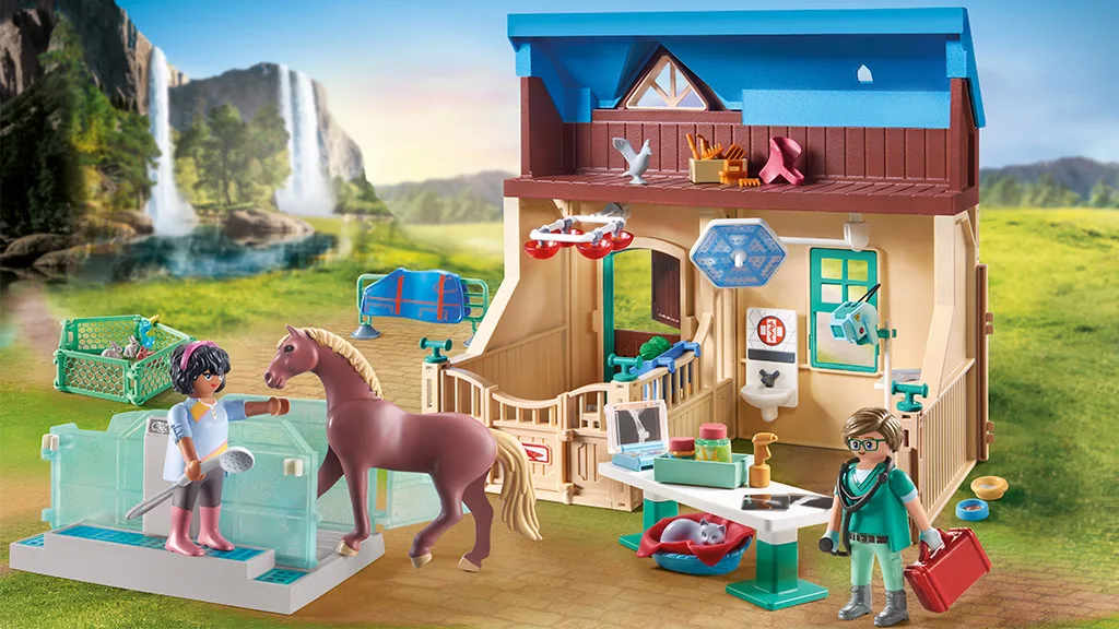 Tato sada o 164 kusech obsahuje vše, co děti potřebují k založení vlastní veterinární kliniky na Waterfall Ranch pro péči o klisny, hříbata a další zvířata. Ideální pro imaginativní hru, sada obsahuje rentgenový přístroj s rentgenovými snímky, běžecký pás pro koně, bazén pro vodní terapii a mnoho dalšího.