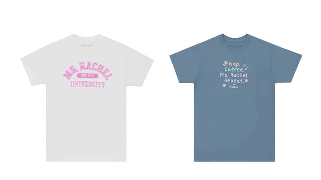 Pokud vaše rodina sleduje paní Rachel společně, můžete si také společně obnovit šatník! Kolekce Out of Print paní Rachel obsahuje trička, dětské oblečení, tašky, hrnky na kávu a mnoho dalšího pro každého, kdo je opravdu šťastný!