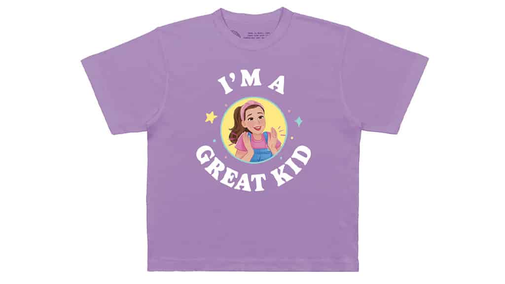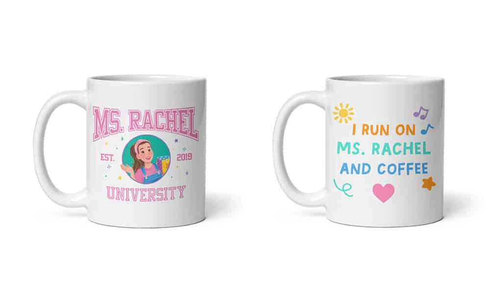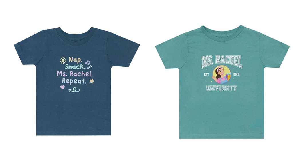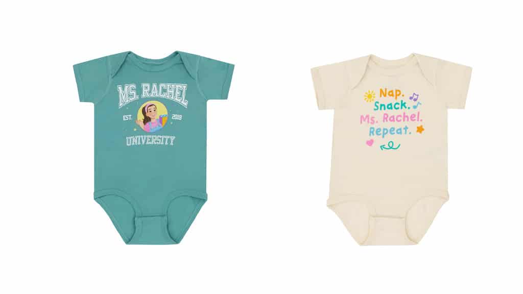 K dispozici jsou dvě dětská body a tři dětská trička pro vašeho malého. Tyto oděvy jsou vyrobeny ze 100% bavlny a obsahují obrázky animované paní Rachel (jak je vidět v její nové obrázkové knize). Na oblečení jsou nápisy jako „Jsem skvělé dítě“, „Spánek. Svačina. Paní Rachel. Opakování“ a „Univerzita paní Rachel“. Trička a body jsou zdobena barevnými ikonami, jako jsou hvězdy, hudební noty, tečky a mnoho dalšího!