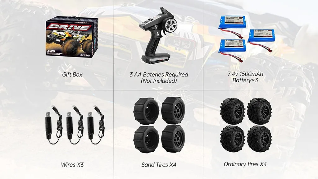 Tento nákladní automobil R/C s pohonem všech kol v měřítku 1:16 je navržen tak, aby snadno zvládal nerovný terén a byl schopen driftovat, otáčet se a skákat. Motor bez kartáčů zrychluje na maximální rychlost 47 mph. Je vybaven 2,4 GHz spoušťovým ovladačem a dodává se s pneumatikami typu písek, které lze použít i ve sněhu. Přichází se třemi bateriemi a třemi nabíječi, což umožňuje, aby nákladní automobil fungoval až hodinu (20 minut na baterii). Mezi příslušenstvím najdete miniaturní šroubovák, klíč a další díly.