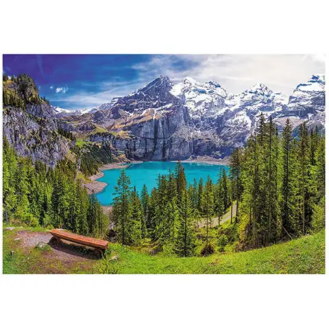 Úžasnou krajinomalbu můžete doplnit na stěnu vašeho pokoje, která zobrazuje Oeschinensee, jež se nachází v Alpách ve Švýcarsku. Puzzle vynikající kvality má lesklý lakovaný povrch, každý z 1500 dílků perfektně pasuje k sobě, takže po složení a zarámování je ideální jako dekorativní prvek. Puzzle má bohatou barevnost a detailní grafiku, na které se objevují zasněžené Alpy a krásně modré jezero. Použijte lepidlo na puzzle, abyste mohli snadno a rychle vytvořit souvislý obraz.