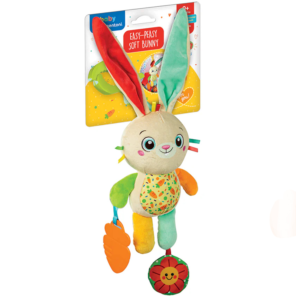 Plyšový zajíček On the go je dokonalým společníkem pro ty nejmenší, ať už jde o procházku, cestování nebo i krátké nakupování. Roztomilý, barevný zajíček na obrázku je vyroben z měkkého materiálu, takže ho lze bezpečně objímat a poskytuje miminku uklidňující pocit. Dlouhé uši, různé textury a veselé, visící doplňky – jako mrkev a květina – rozvíjejí při hře smyslové vnímání a jemnou motoriku. Díky praktickému klipu ho můžete snadno připevnit k kočárku, autosedačce nebo postýlce, takže ho budete mít vždy po ruce.
