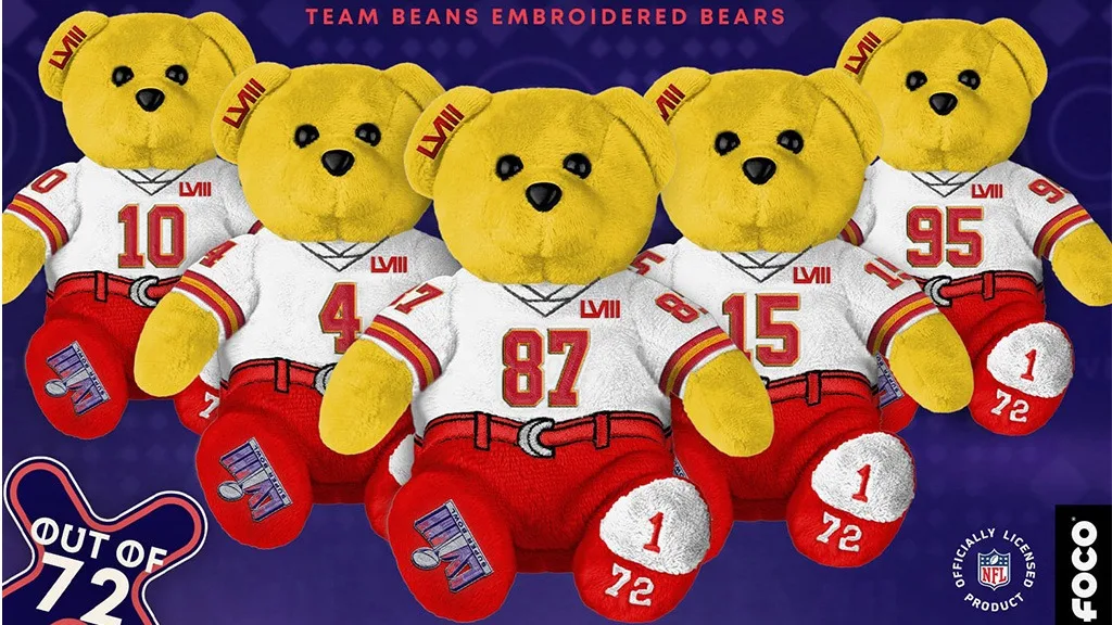 Sbírka obsahuje 14 medvědů pro všechny druhy fanoušků. Můžeš si vybrat z pěti klíčových hráčů, kteří pocházejí z týmu Kansas City Chiefs nebo San Francisco 49ers, stejně jako ze čtyř oficiálně licencovaných medvědů Super Bowl 58.
