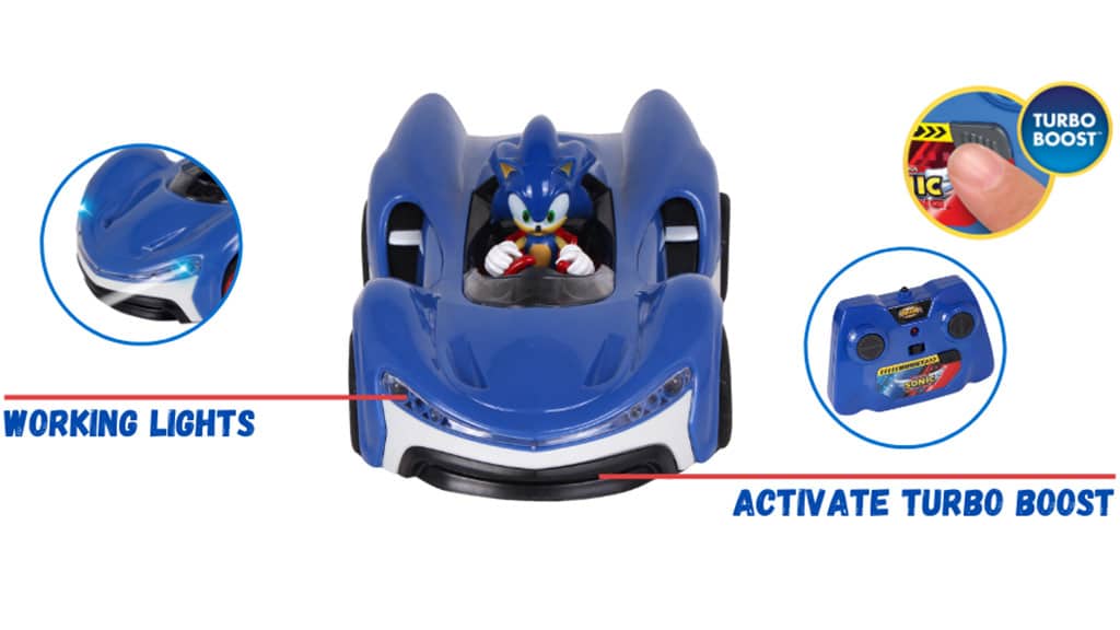 Ať už běží pěšky, nebo se řítí se svým dálkově ovládaným autem, Sonic musí být vždy rychlý. Toto dálkově ovládané auto je vybaveno přilnavými pneumatikami a funkčními LED světlomety. Speciální konstrukce vozidla umožňuje snadný pohyb i v nejtěžším terénu, takže Sonic může překonat všechny překážky. Rychlost a dobrodružství jsou s touto fantastickou hračkou zaručeny!