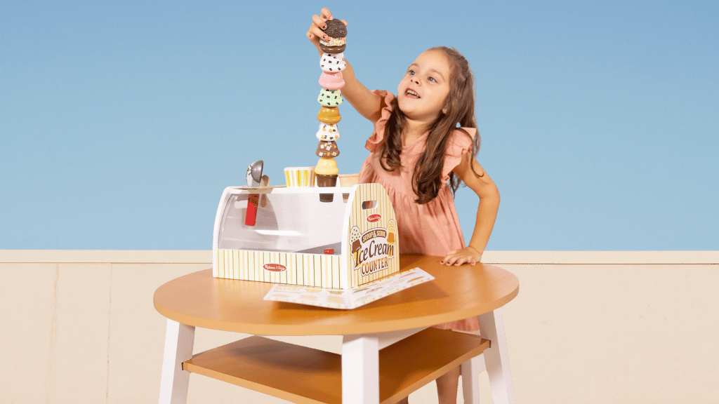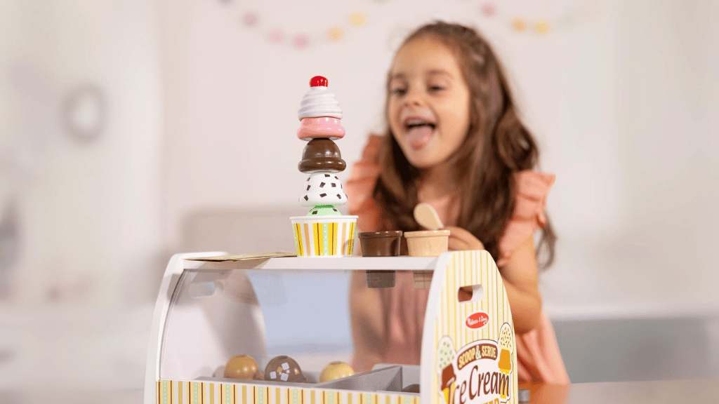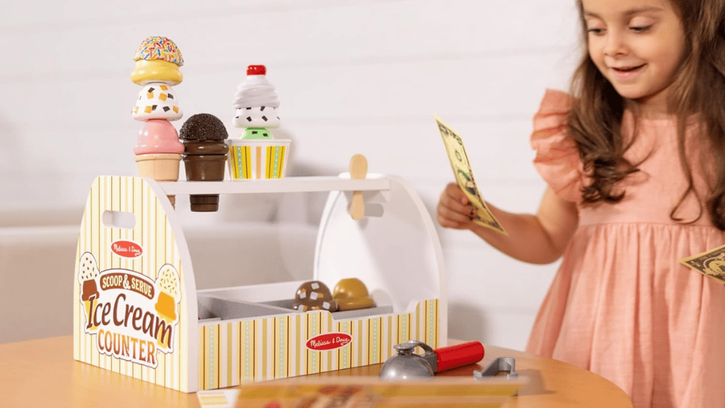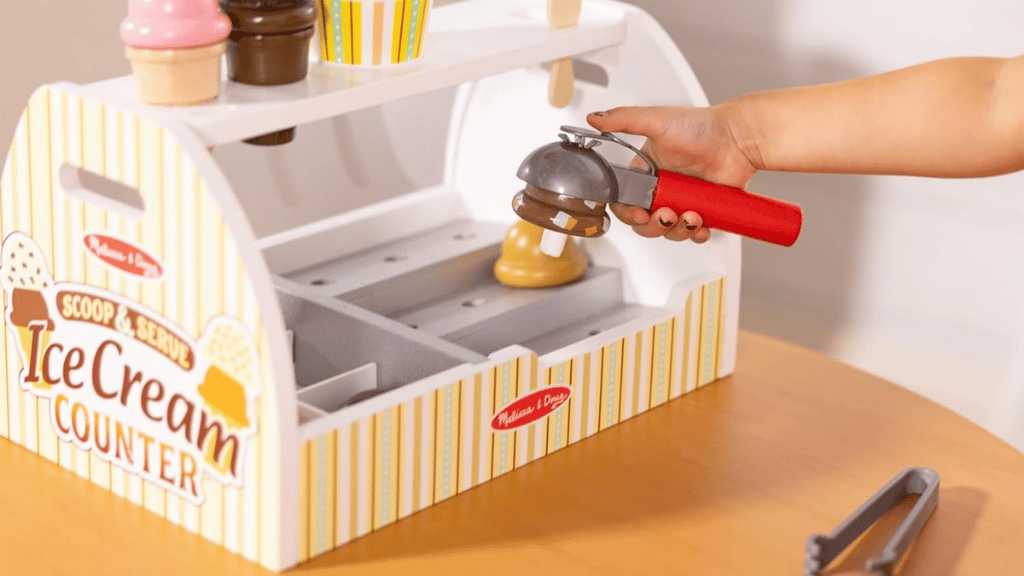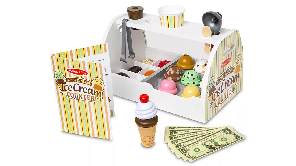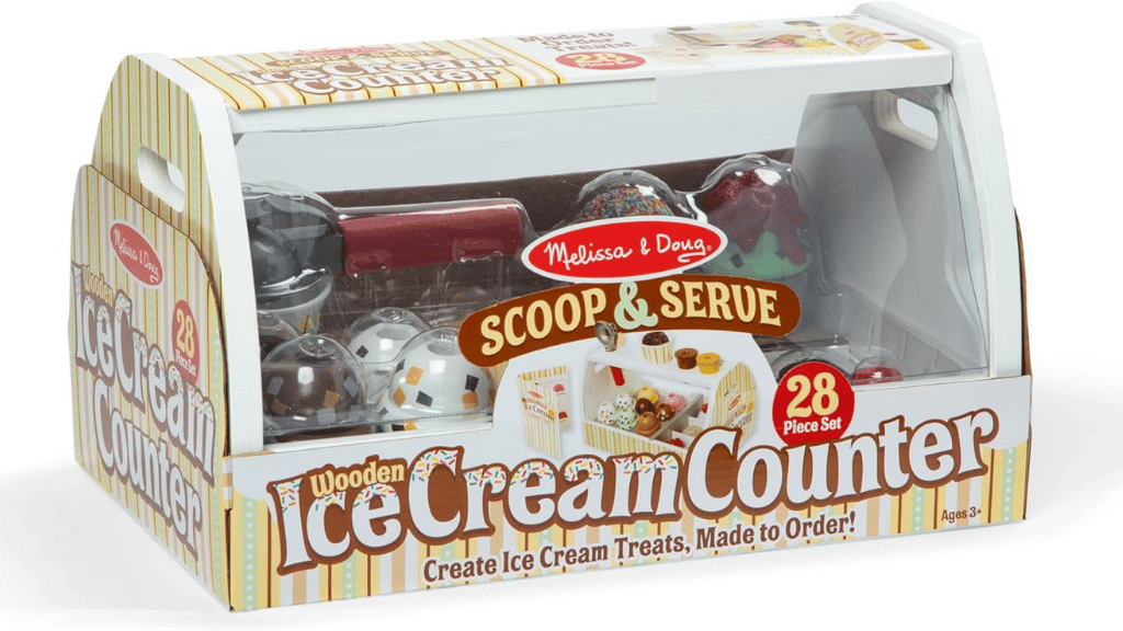 Ponořte se do sladkého světa hraní rolí s pomocí **Melissa & Doug Scoop and Serve Ice Cream Counter**! Tato kouzelná sada obsahuje robustní dřevěný pult, který je vybaven vším, co děti potřebují k provozování vlastního **zmrzlinového obchodu**. Od osmi různých příchutí zmrzlinových kopečků, přes polevy, kornouty a servírovací nástroje, tato sada podporuje **kreativitu** a společenskou hru. Děti mohou přijímat objednávky na opakovaně použitelných menu kartách, nabírat a vrstvit zmrzlinu a objevovat imaginární **scénáře hraní rolí**.
