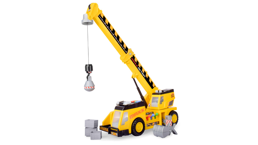 Sunny Days Entertainment Maxx Action 3 v 1 Jeřábový nákladní vůz nabízí 27 palců stavební hry. Děti mohou snadno používat joystickové ovladače k zvedání, lámání a přesouvání stavebních kostek! Jeřábový nákladní vůz je vybaven třemi doplňky — lžící, hákem a demoliční koulí — takže děti mohou hrát různými způsoby. Jeřábový nákladní vůz se otáčí o 360 stupňů, zvedá až do výšky 30 palců a pohybuje se dopředu a dozadu stisknutím tlačítka. Navíc má blikající světla a realistické stavební zvuky.