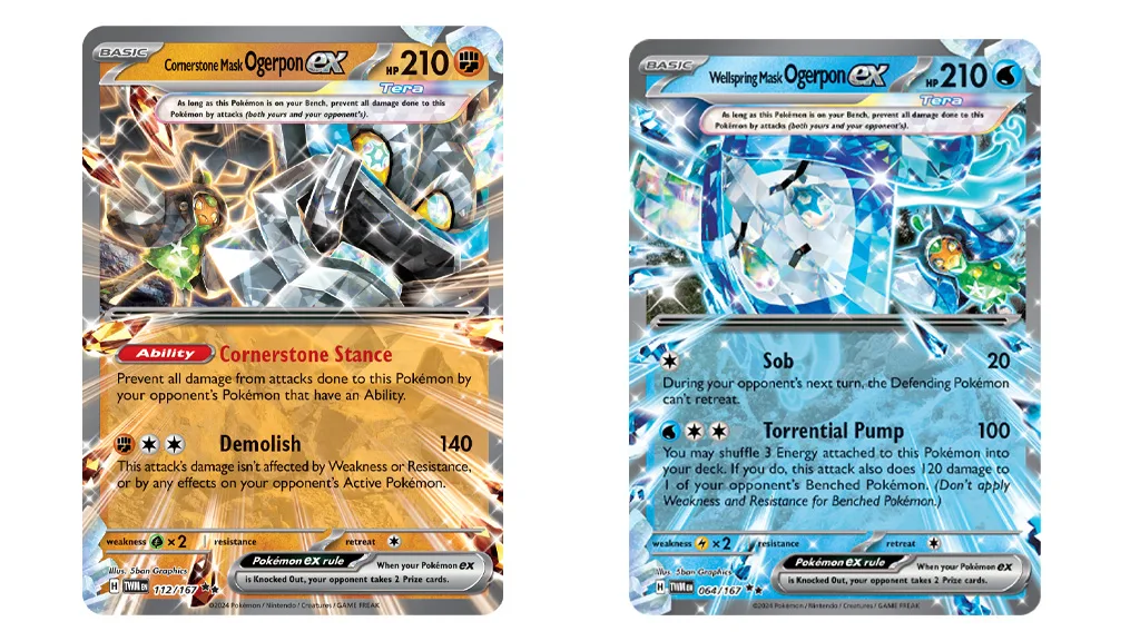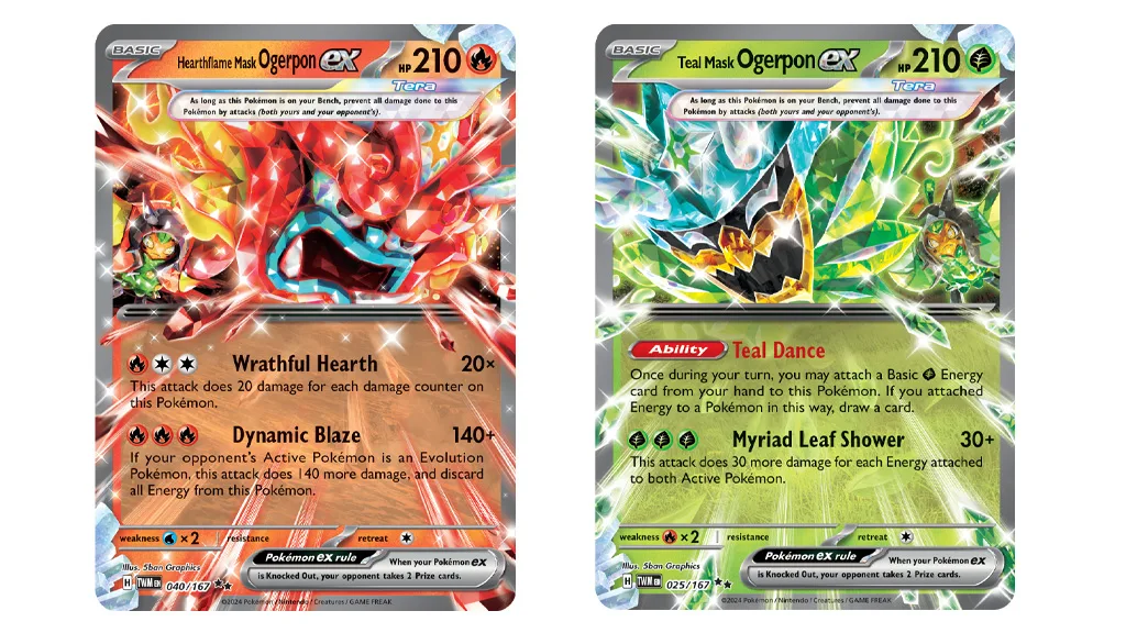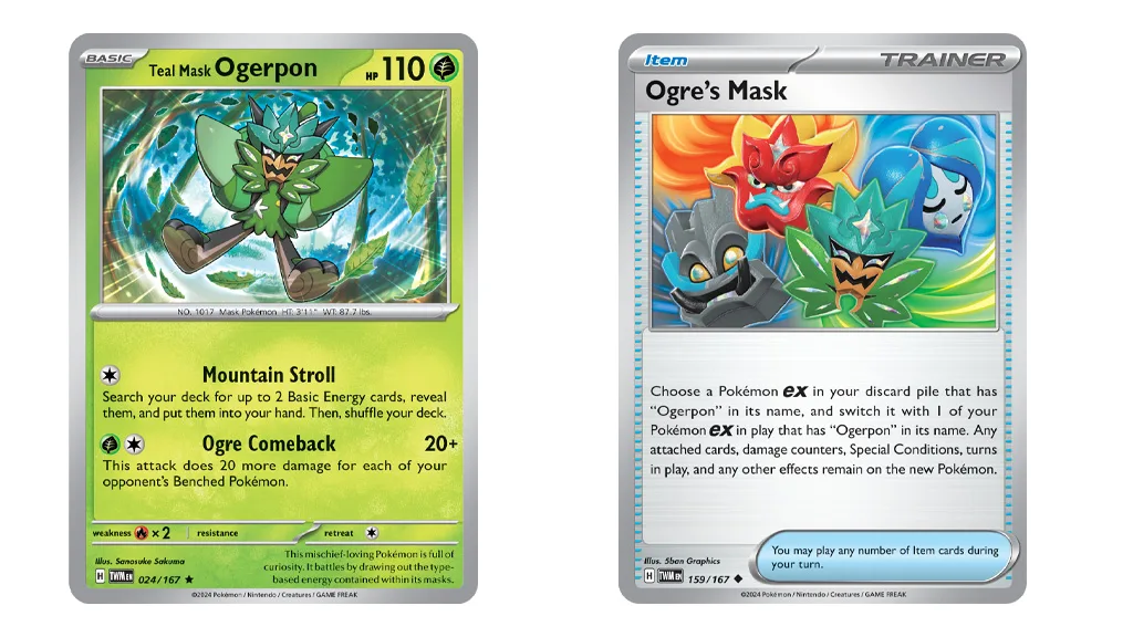 Debut Ogerpona v Pokémon TCG je velká událost a Pokémon Co. International to odpovídajícím způsobem slaví: Šest nových karet bylo odhaleno z doplňku Scarlet & Violet — Twilight Masquerade. Hráči se nemohou dočkat, až přidají karty Teal Mask Ogerpon ex, Hearthflame Mask Ogerpon ex, Wellspring Mask Ogerpon ex, Cornerstone Mask Ogerpon ex, Teal Mask Ogerpon a Ogre’s Mask do svých bitev.
