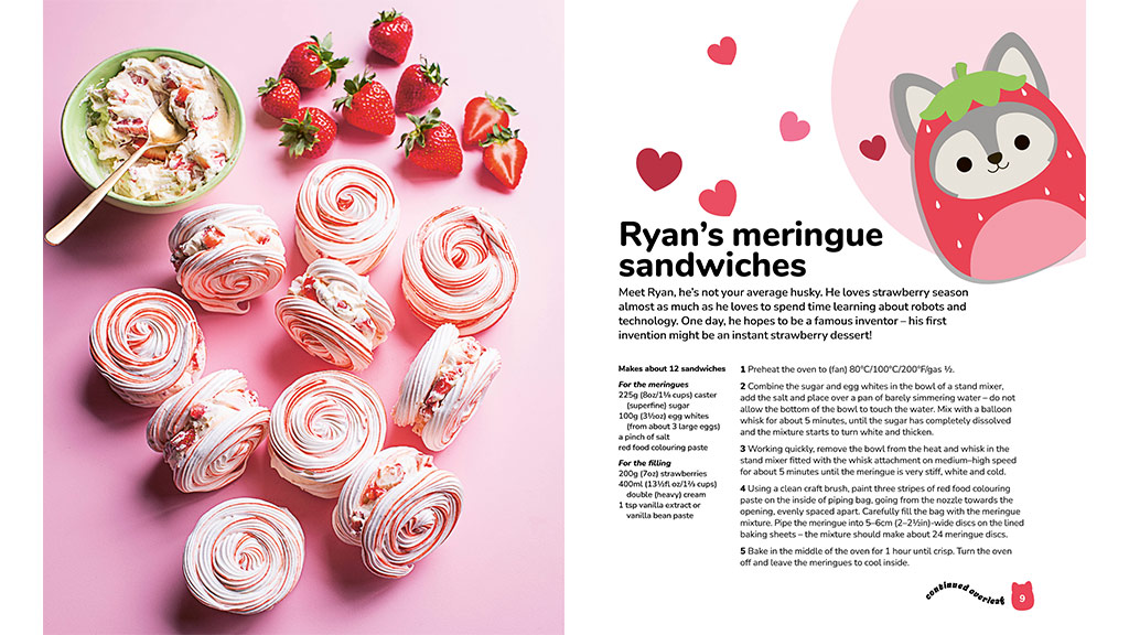 Tato kniha obsahuje 50 receptů inspirovaných Squishmallows, které mohou děti připravovat společně s rodiči. Mezi recepty najdete pečivo, dorty, sušenky, cukrovinky a nápoje, které může celá rodina připravovat po celý rok. Cílem knihy je poskytnout rodinám společné zážitky v kuchyni při přípravě chutných a kreativních jídel. Každý recept je snadno sledovatelný a krok za krokem vede děti a jejich rodiče k úspěšnému pečení a vaření. Kniha klade zvláštní důraz na to, aby se děti mohly aktivně zapojit do procesu, čímž rozvíjejí své kuchařské dovednosti a kreativitu.
