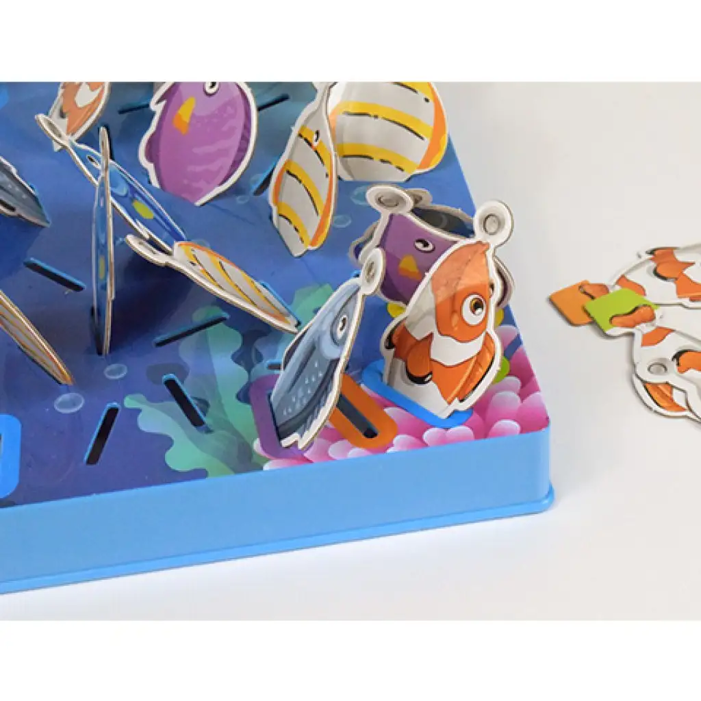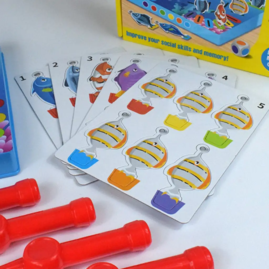Přinesli jsme skvělou společenskou hru, kterou si užije celá rodina, protože je zábavná, ale přesto bude potřeba i paměť. Hra se skládá z herní desky o rozměrech 20x20 cm, ryb, rybářských prutů a kostky. Podstatou hry je, že na spodní straně každé ryby je vidět barva, která po umístění na desku již není vidět - kromě ryb v rozích - a úkolem je vylovit rybu s barvou, kterou ukáže kostka, pomocí rybářského prutu. Pokud se spletete v barvě, přichází na řadu další hráč, a na konci vyhrává ten, kdo vylovil nejvíce ryb. Hra je tedy nejen zábavná, ale také procvičuje mozek a vyžaduje i zručnost. Pořiďte si ji a hra může začít.