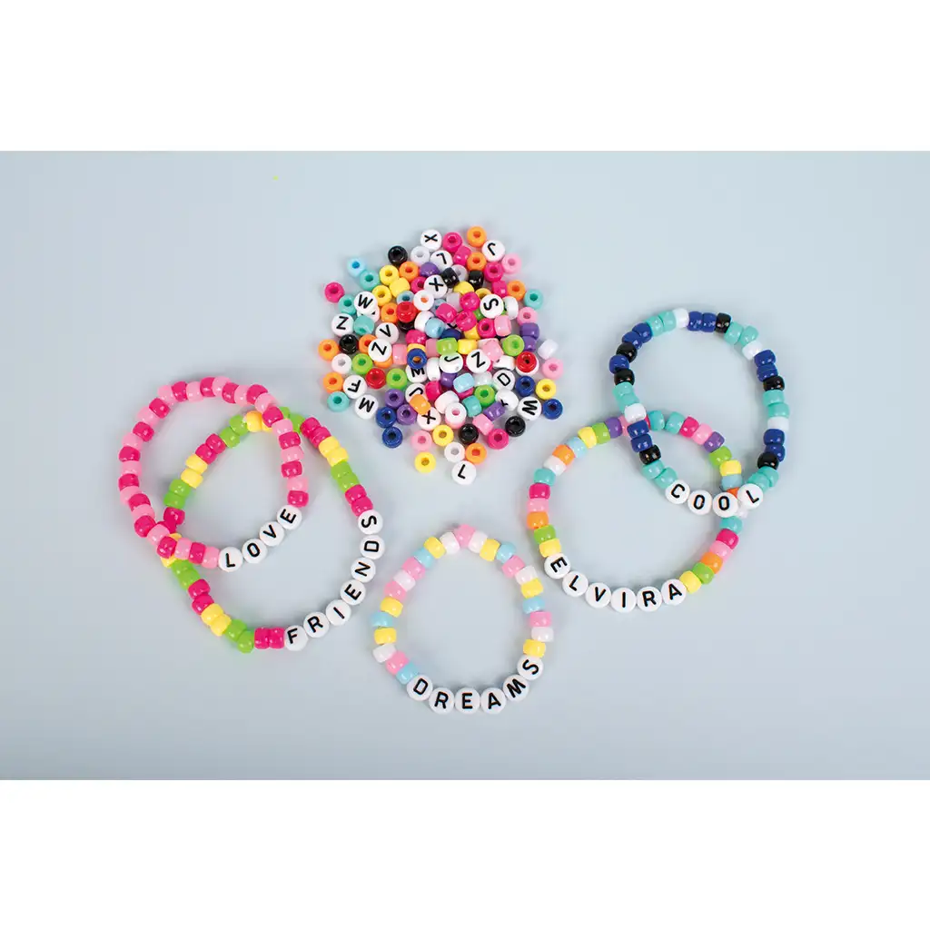 Korálky s černými písmeny na bílém podkladu jsou dobře čitelné a barevné korálky dodávají hotovým šperkům veselý, živý vzhled. Sada obsahuje všechna písmena velké abecedy, takže lze vytvořit jakékoli jméno, slovo nebo krátký vzkaz. Velikost korálků je ideální pro dětské ruce, otvory jsou dostatečně velké pro snadné navlékání na šňůru nebo gumičku.