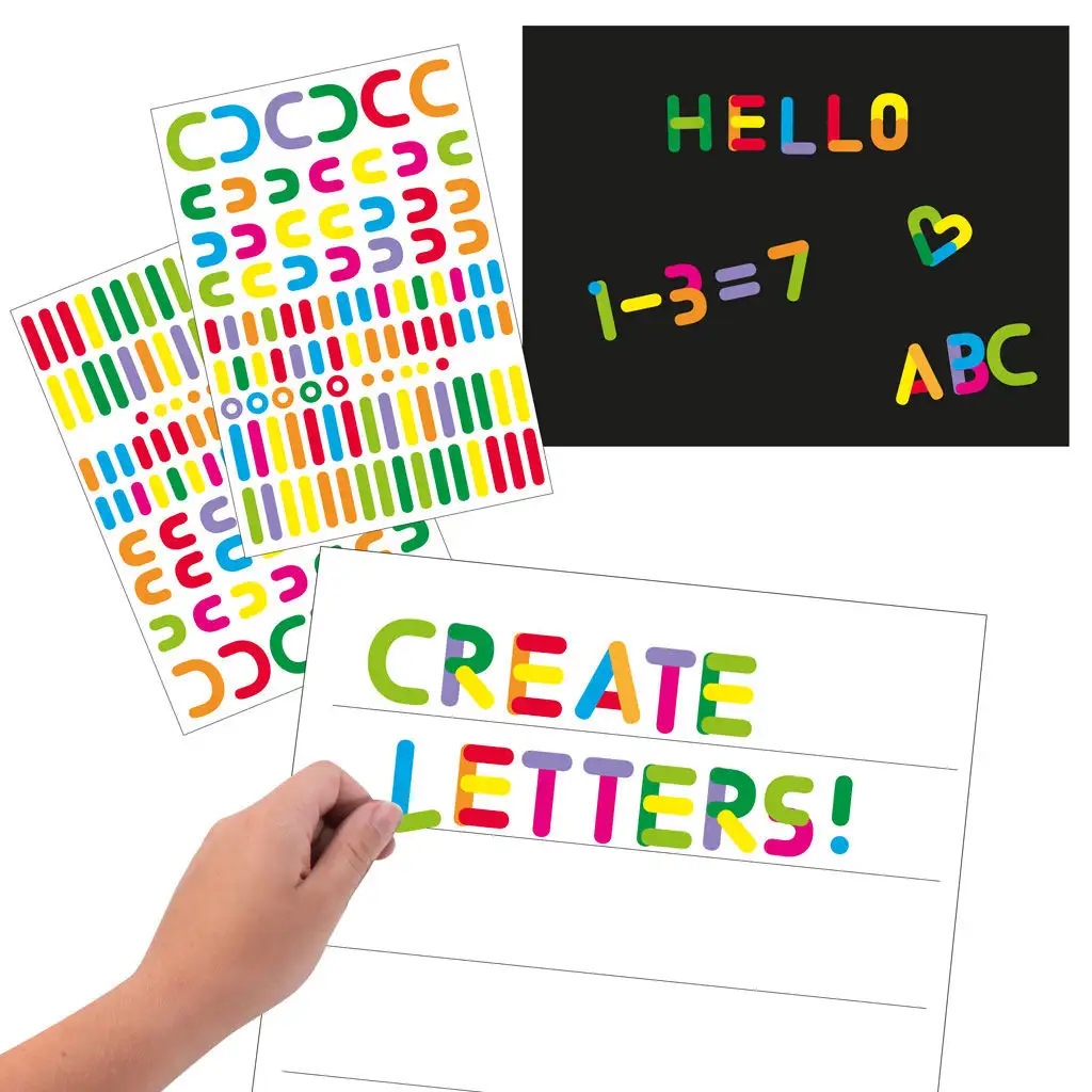 Výuka tvorby písmen je skvělým způsobem, jak děti hravě rozvíjet rozpoznávání písmen a psaní. Sada obsahuje 6 šablonových listů s celkem 600 samolepkami, které tvoří různé tvary, a s jejich pomocí lze vytvořit všechna písmena. Jednoduše nalepte tvary na přiložené listy a můžete začít cvičit stavbu písmen.