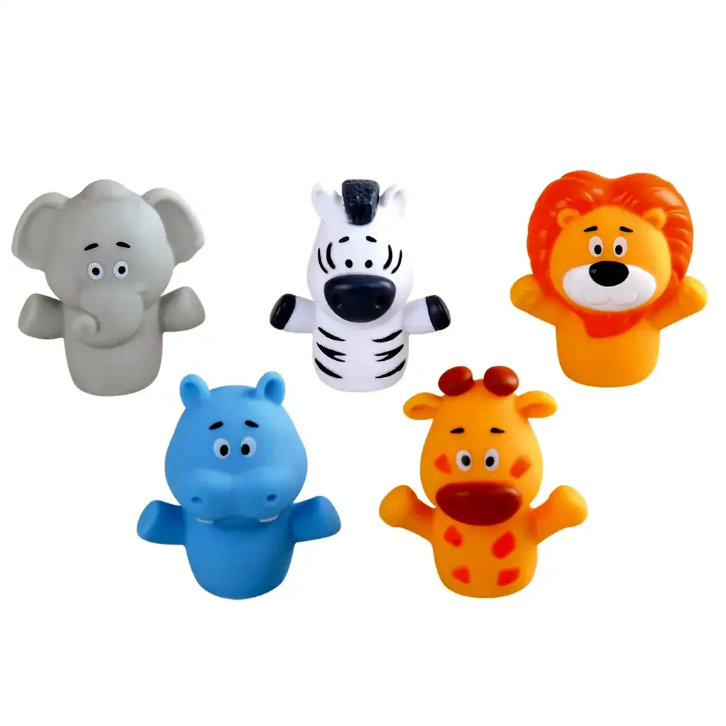 - 5dílná sada prstových maňásků se safari zvířátky (slon, lev, žirafa, hroch, zebra)