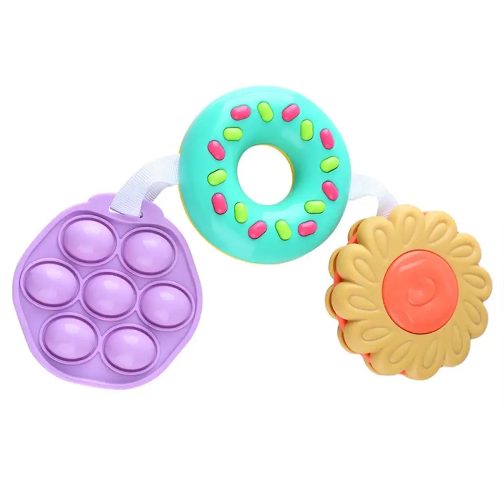 Prvním členem Tria je fialový "pop it" bublinkový panel, který poskytuje nekonečnou zábavu pro dítě. Mačkání tlačítek je nejen zábavné, ale také pomáhá rozvíjet jemnou motoriku. Druhým prvkem je hračka ve tvaru cukrové polevy, která svými veselými barvami a detailním designem upoutá pozornost dětí a podporuje rozvoj zraku. Třetím prvkem je chrastítko ve tvaru usměvavé květiny, které svým příjemným zvukem rozvíjí sluch a porozumění příčinným souvislostem.
