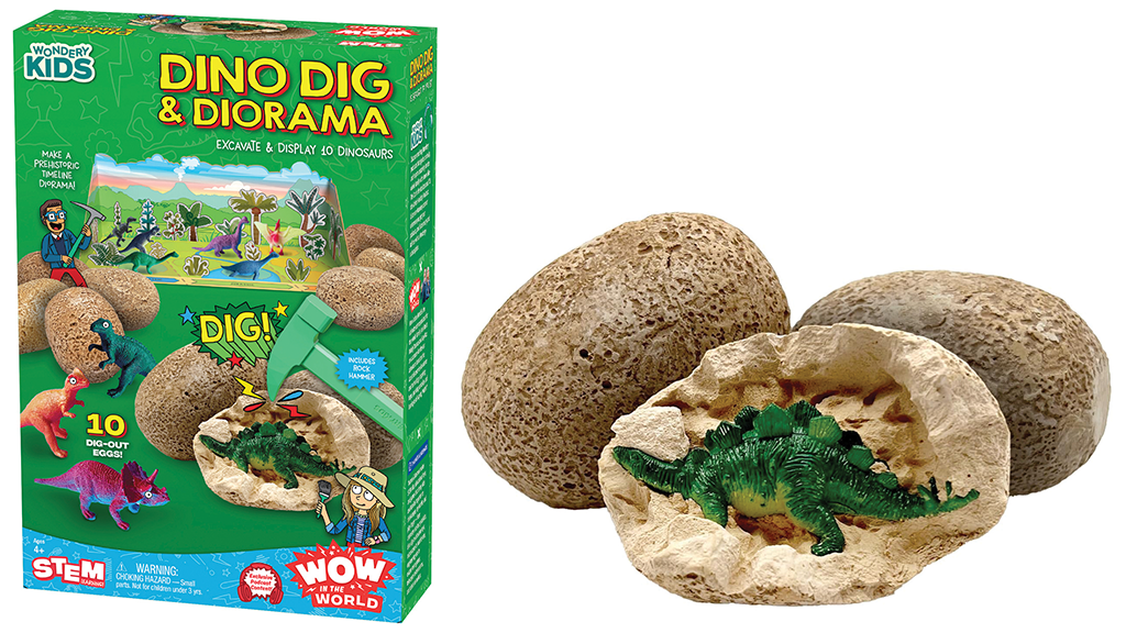 Dalekohled je vybaven kvalitními čočkami, nastavitelnou šířkou, měkkými očnicemi a kolečkem pro zaostřování. Osmistránkový manuál sleduje pokrok dětí při přírodovědném lovu pokladů, zatímco poslouchají venkovní vedenou túru s moderátory pořadu Wow in the World, Guyem Razem a Mindy Thomas. Tento dalekohled nejenže činí objevování přírody vzrušujícím, ale také pomáhá dětem v učení, zatímco zábavným způsobem poznávají své okolí.Sada obsahuje 10 vajec, která lze vykopat, abyste objevili figurky dinosaurů. Děti mohou sestavit kartonové dioráma a vytvořit tak výstavu dinosaurů v muzeu. Tato aktivita je nejen zábavná, ale i vzdělávací, protože děti se mohou seznámit se světem dinosaurů, zatímco rozvíjejí svou zručnost a kreativitu. Sada může být ideální volbou jako dárek k narozeninám nebo pro společný rodinný program.