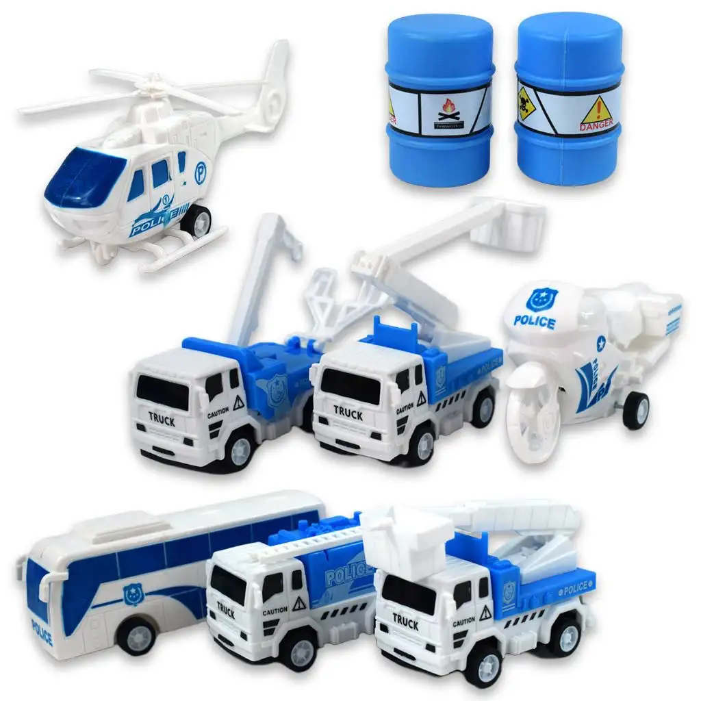 S tímto skvělým setem vozidel mohou děti v mžiku uklidit ve městě, protože obsahuje celkem sedm policejních vozidel. S různě funkčními nákladními auty, autobusy, helikoptérou a motorkou se mohou během hry snadno pustit do boje proti zločincům, zatímco doplňkové hračky jim poskytnou ještě vzrušující zážitek ze hry. Děti mohou volně rozvíjet svou kreativitu, uklidit ve svém městě a začít vzrušující roli!