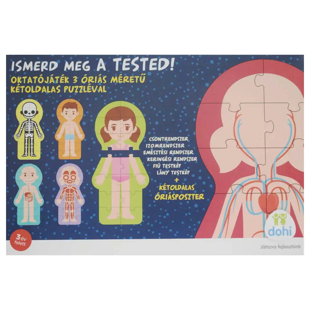 Sada obsahuje tři obří oboustranné puzzle, která ukazují lidské tělo z různých pohledů. Dítě tak pozná kostru, svaly, oběhovou soustavu, trávicí systém i základní rozdíly mezi tělem chlapce a dívky. Na druhé straně je oboustranný obří plakát, který pomáhá s dalším učením a opakováním a může být i zavěšen na zeď v dětském pokoji, aby byl stále na očích.