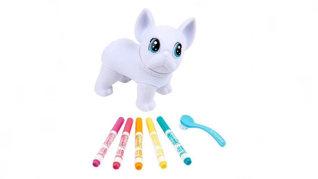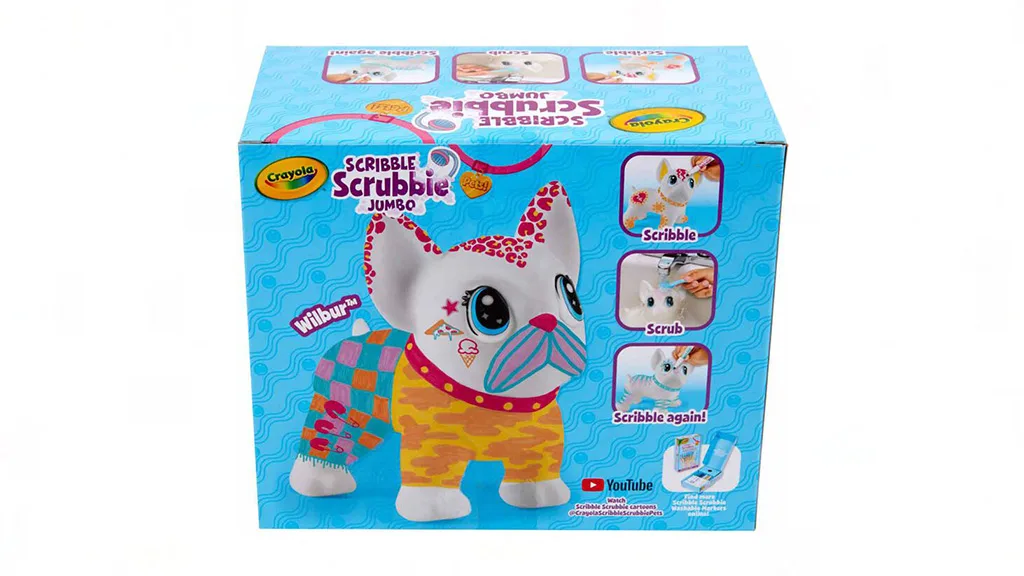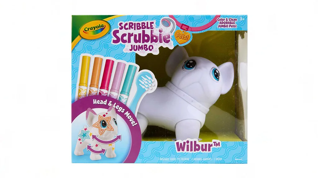 Crayola přináší hru Scribble Scrubbie v nové velikosti s tímto obřím francouzským buldočkem. Wilbur přichází se speciálním čistícím kartáčem a pěti nejedovatými fixy v živých barvách: růžová, oranžová, žlutá, fialová a modrá. Vysoký přibližně 15 cm a široký 7,5 cm, tento Scribble Scrubbie pes nabízí bohatou plochu pro dětská umělecká díla, navíc má pohyblivou hlavu a nohy, takže může zaujmout jakoukoliv pozici. Děti mohou kreslit fixy oblečení, vytvářet vzory nebo psát příběhy na jeho srst. Když jsou připraveni na čistou paletu, stačí ho umýt vodou a sledovat, jak barvy mizí!
